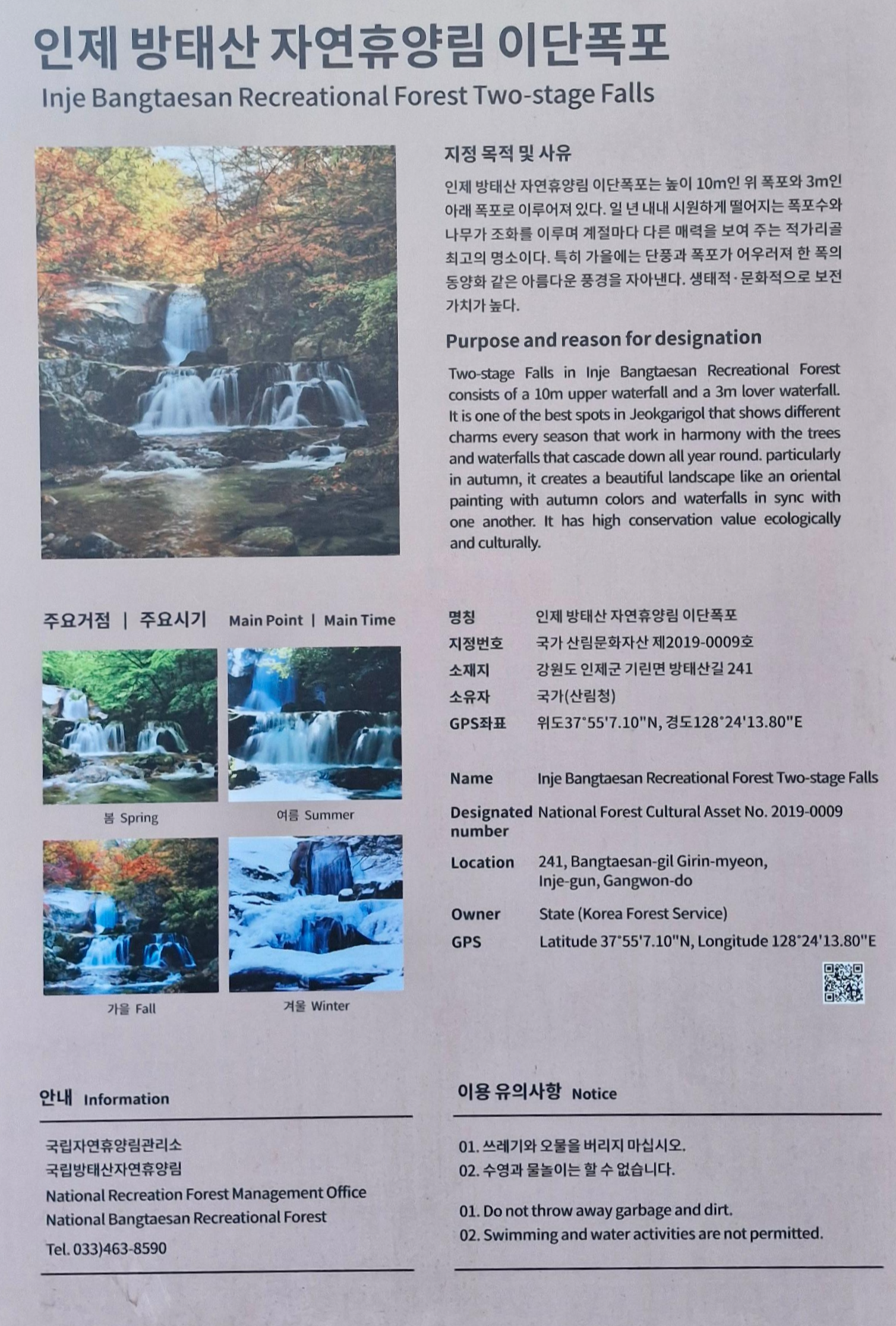 높이 10m인 위 폭포, 3m인 아래 폭포는 일 년 내내 시원스럽게 흘러내리면서 주변 나무와 어울린 풍경이 한 폭의 동양화 같다고 했지요.