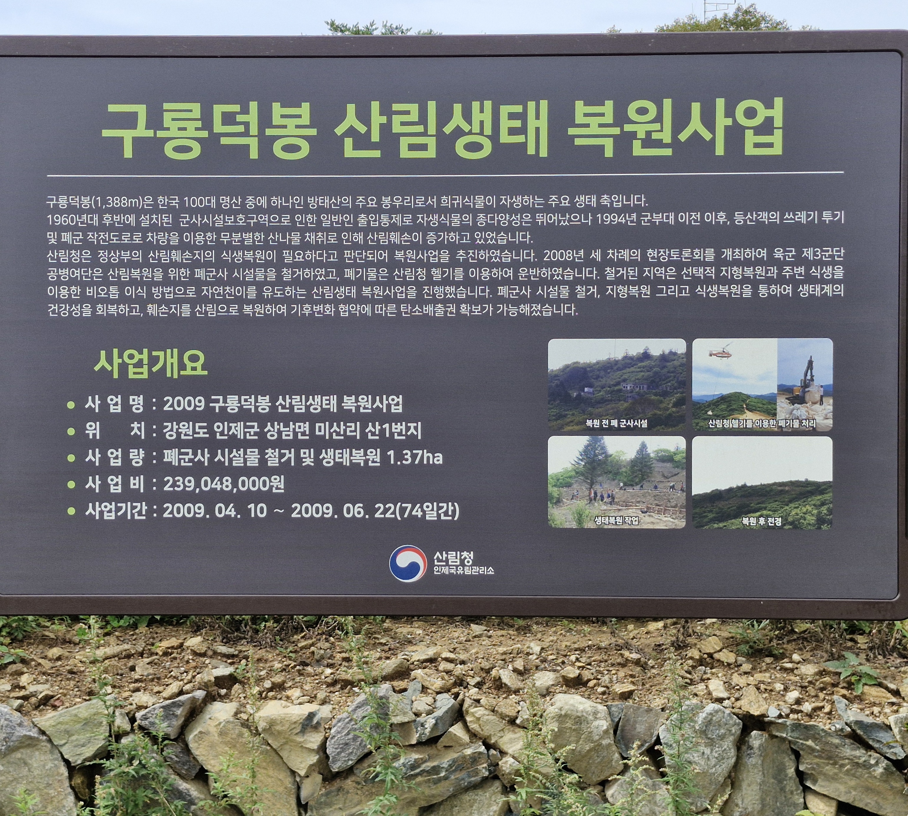 구룡덕봉에 주둔했던 군부대가 철수하면서 산림청에서는 훼손된 산림을 복구하기 시작, 지형복원과 식생복원으로 이 땅의 생태계를 회복시켰답니다.