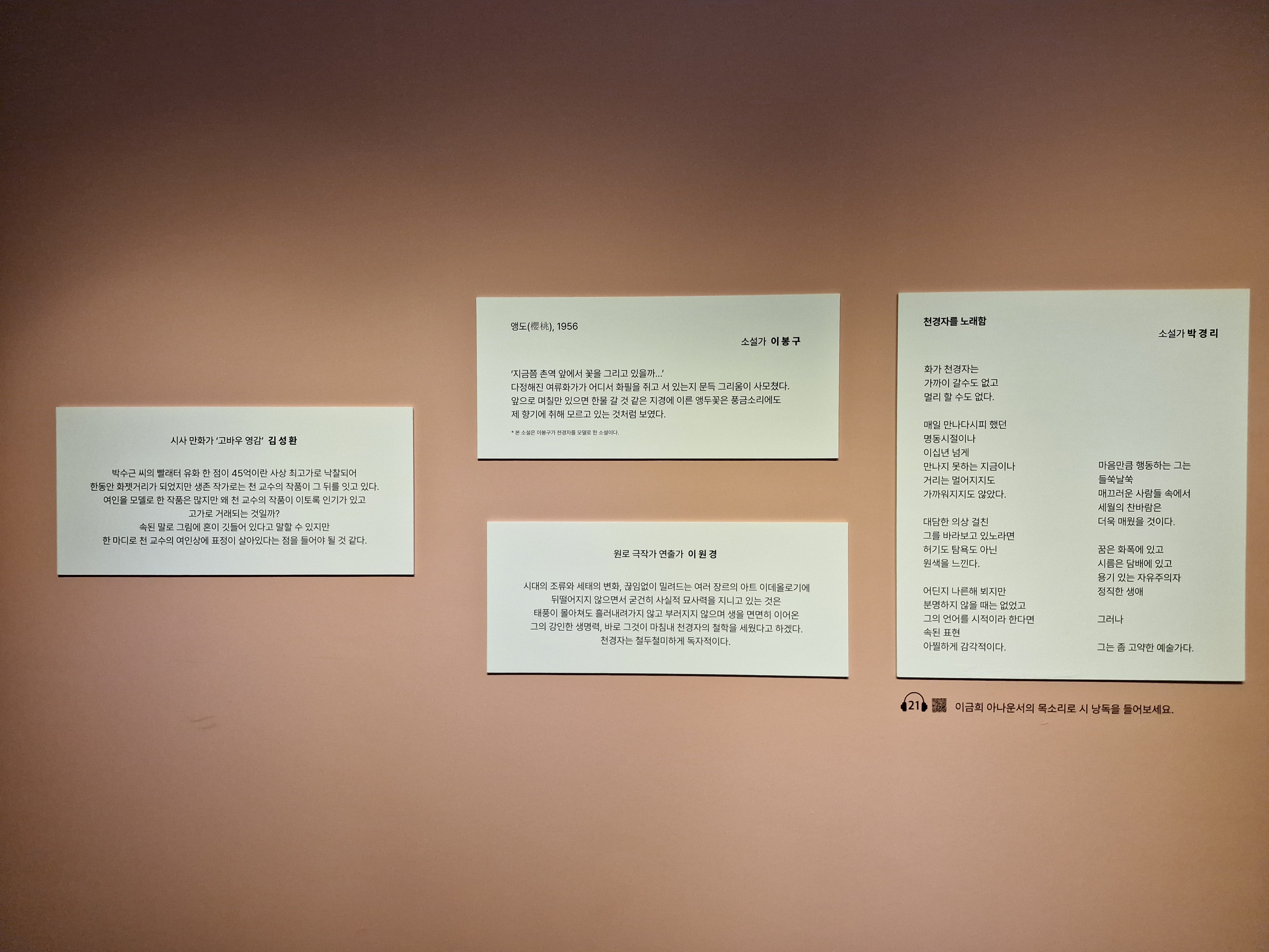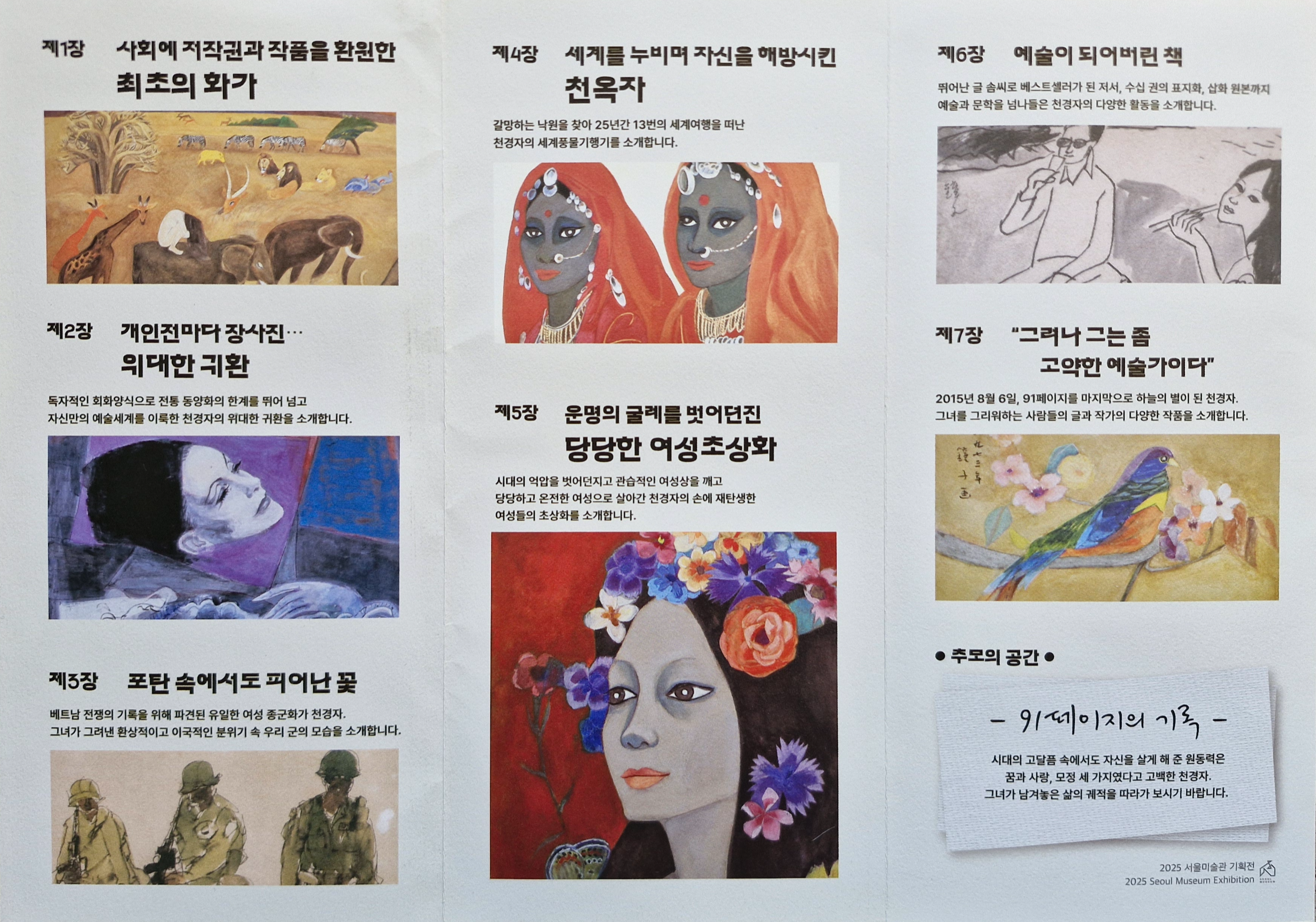 전시회는 작가의 생애와 예술세계를 6개의 장으로 나누어 '위대한 예술가, 천경자'를 추모하고 있었네요.
