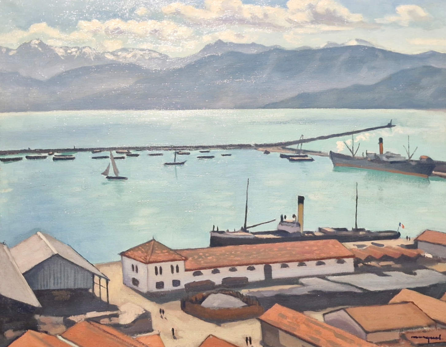 '알베르 마르케'의 '햇빛을 받는 알제리의 부지 항구'에서는 북아프리카의 강렬한 햇빛과 지중해의 아름다운 물빛을 볼 수 있습니다.