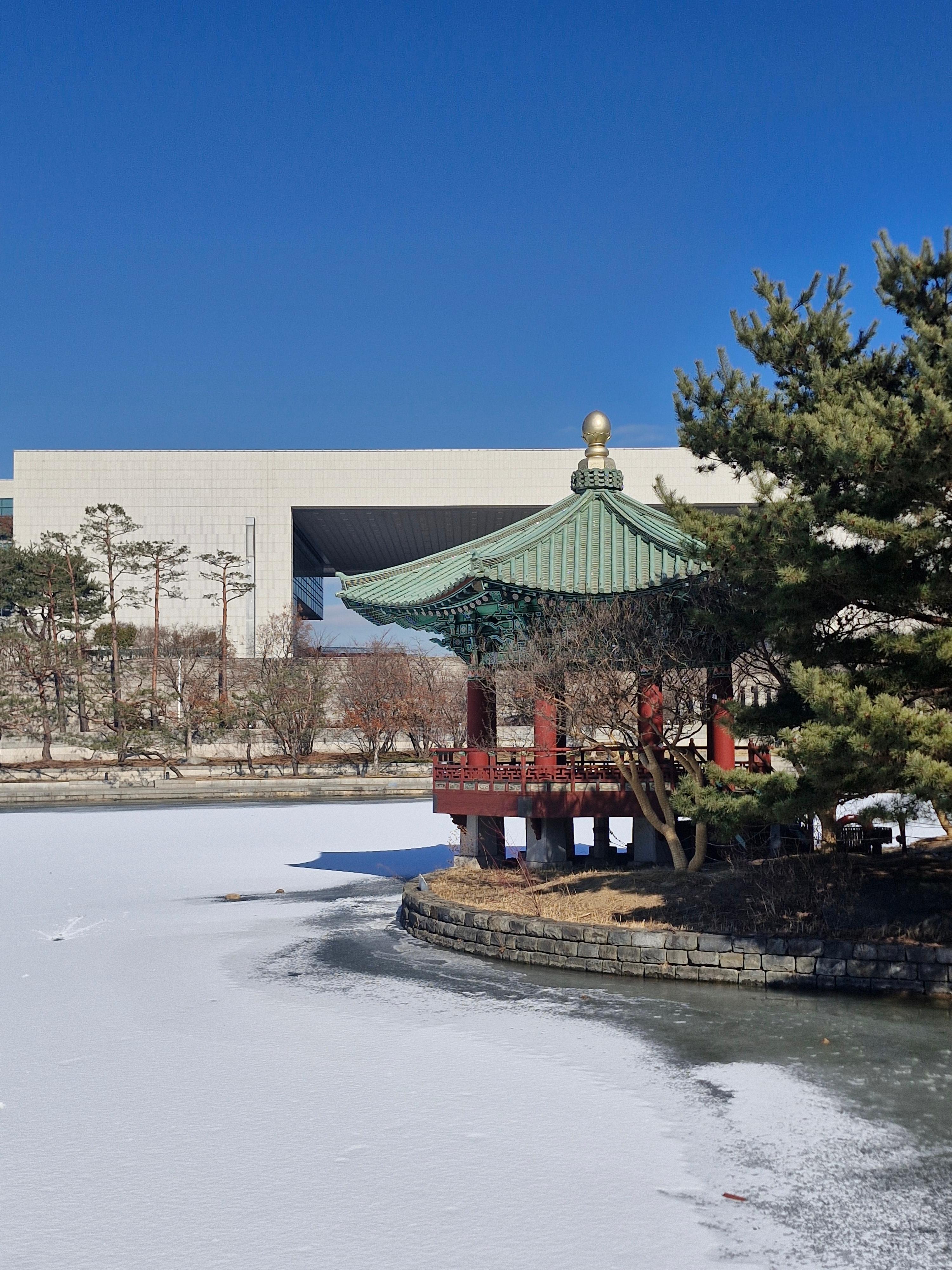 지난밤 내린 눈으로 하얗게 덮인 중앙박물관의 '거울 연못'까지.